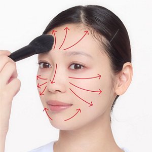 フォギー肌を作るときは、ふんわり仕上がりのフェイスパウダーを顔全体にのせるのがおすすめ。パウダーは付属のパフでつけるのが基本ですが、今回はごくごく薄く軽くのせるために、大きなブラシにパウダーを含ませて矢印の方向に払うようにしてフワッとのせます。