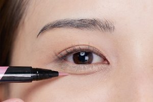 にっこり笑って涙袋の位置を確認し、下まぶたの中央にライナーで影を描きます。このときに下まぶた全体に広げてしまうとクマのように見えてしまうので、黒目幅の下を意識して描くのがコツです。
