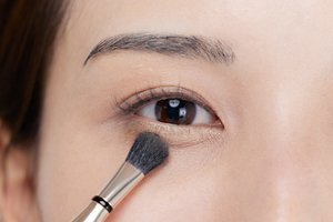 手順1でつくった影をガイドにして、涙袋の膨らんだ部分に肌の色になじみやすい明るめのベージュ系アイシャドウをブラシでふんわりとのせます。その後、綿棒で影をぼかします。