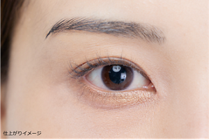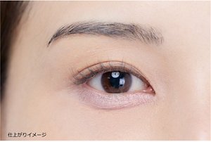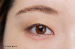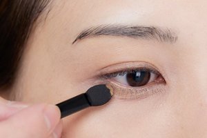 目尻から黒目の内側部分に、下まぶたに自然な影をつくるように、手順2より少しだけ濃い色のブラウン系アイシャドウをチップでのせます。ふんわりとした影を目尻につくることで涙袋がより大きくぷっくりと見えます。