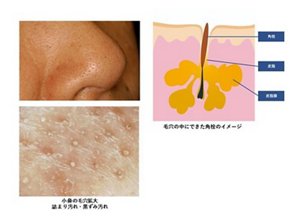 鼻の毛穴の黒ずみ汚れや、ざらつきの原因となる毛穴の詰まり汚れの正体は、毛穴内部で分泌された皮脂と古い角層が混ざり合った固形物で、「角栓」と呼ばれるものです。