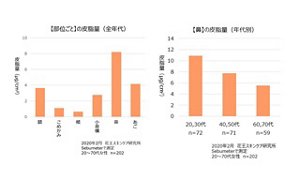 皮脂分泌の量は、顔の中でも部位によって異なります。頬に比べて額・鼻・あごは皮脂量が多く、過剰な皮脂が毛穴に溜まりやすい部位。個人差はありますが、鼻の皮脂分泌は20~30代が他の年代に比べて多いことがわかります。