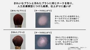 きれいなメイクブラシと汚れたメイクブラシに同じパウダーチークを取り、人工皮膚模型にのせた実験では、明らかに仕上がりの違いが。