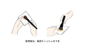 使用後は、毎回ティッシュなどの上で優しく丁寧にブラシを往復させながら、付着したメイクや皮脂などを拭き取ります。毛先や毛の表面以外に、毛の内側の汚れも忘れずに拭き取りましょう。その際、力を入れすぎてブラシを傷めないように気をつけます。