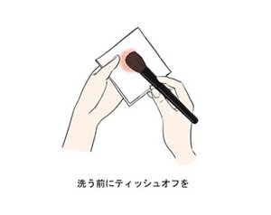 洗う前に、メイクブラシに残ったチークやアイシャドウなどを、ティッシュなどで優しく丁寧に拭き取ります。