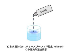 間口が狭めで、やや高さのある容器にぬるま湯500㏄を溜め、中性洗剤をティースプーン1杯程度(約5㏄)入れます。洗剤の量は、洗剤の種類やメイクブラシの汚れの程度に合わせて調整しましょう。