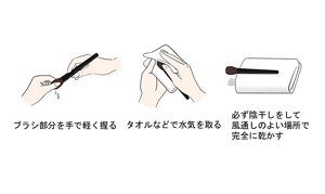 ブラシ部分を手で軽く握り、タオルなどで水気を取ります。そのあとブラシの形を整え、必ず陰干しして風通しのよい場所で完全に乾かします。