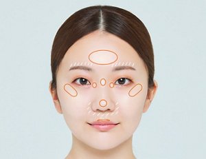 小顔に見せるためには顔の立体感を強調し、引き締まった輪郭に見せることがポイント。まずは基本の位置にハイライトを入れたら、小顔向けにさらにプラスしていきます。
