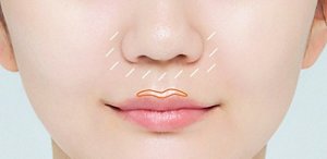 唇の山の上に細めにハイライトを入れると、唇がふっくら見えて人中が短くなったような印象に。口もとに立体感が演出できるので、小顔印象もUPします。