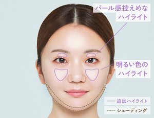 ハイライトには、明るさやツヤ、立体感などを演出する効果があり、顔の中で光を集めたい部分に入れることでその効果が発揮されます。肌の明るさや透明感が増して見え、イキイキとしたフレッシュな印象を与えることができます。