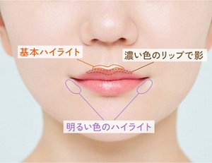 さらに、口角下の影になりやすい部分にもハイライトを入れることで、口角が上がって見えて明るくぷっくりとした印象の唇に。