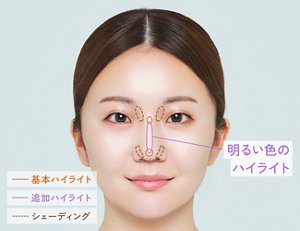 この状態で基本と同じ2か所にハイライトを入れると、鼻筋が高く、鼻先がツンと上を向いた印象に。