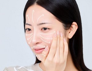 適量を手に取ったあと、指の第二関節くらいまでを目安に広く使って、顔の中心から外側に薄く塗り広げます。
