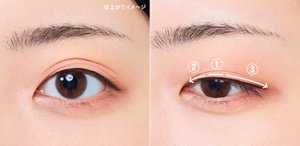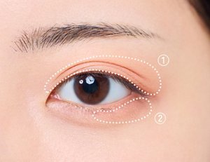 上まぶたは、目を開けたときにまぶたの約半分程度の高さまで色が見えている状態にするのがポイント(①)。