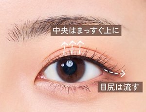 中央のまつ毛はまっすぐ上に塗り、外側は斜め上に持ち上げながら。目尻は横に流すように塗ると、目もとが自然に引き立つ扇型のフォルムになります。