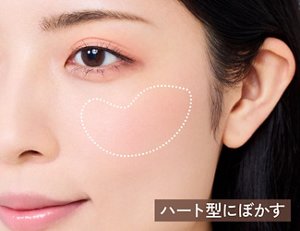 頬にはふんわり広めにチークを入れます。チークの輪郭が出ないようにハート型にぼかすのがポイントです。