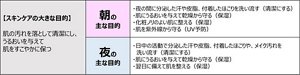 朝~夕方を中心に活動して夜は休む、という一般的な活動スタイルの場合、朝と夜のスキンケアの目的の違いは以下のようになります。
