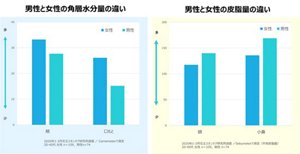 花王の調査によると、男性の肌は、女性よりも皮脂量が多くベタつきがちな一方で、水分量が低い傾向にあります。