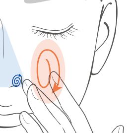 頬に塗るときは目尻の横に手を置き、頬の毛穴が目立たなくなるまで斜めに引き上げてから、「の」の字で下地をなじませましょう。