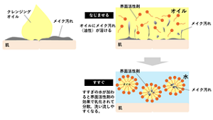 そして、洗い流すときに重要な働きをするのが、クレンジング料に含まれる界面活性剤。界面活性剤には、本来混ざらない油と水をつなぎあわせる「乳化」という働きがあります。そのため浮かせたメイク汚れ(油性)を含むクレンジング料にすすぎの水が混ざることで、メイクが溶けた油性成分が界面活性剤により乳化されて分散し、サッと洗い流すことができるのです。