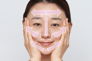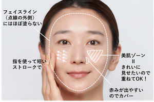 指の腹を肌に密着させるようにして、内側から外側に向かって短いストロークでファンデーションを塗っていきます。人の視線が集まりやすい頬の「美肌ゾーン」をきれいに整えると肌が美しく見えるので、この部分にはファンデーションを少し重ねるといいですよ。