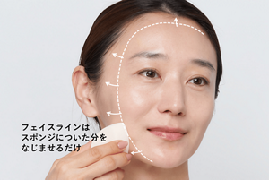 フェイスラインは、スポンジについたファンデーションを外側に軽くなじませるだけに留めます。また、口周りはファンデーションをたくさん塗らないようにするのも若見えのポイントに。