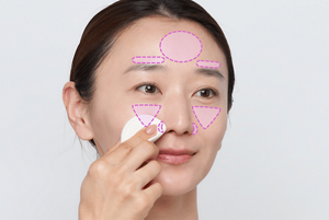 粉っぽい仕上がりを防ぎファンデーションの自然なツヤをいかすためにも、額、眉の上、小鼻といった皮脂分泌が多く化粧がくずれやすい部分や、頬の「美肌ゾーン」などにのせましょう。