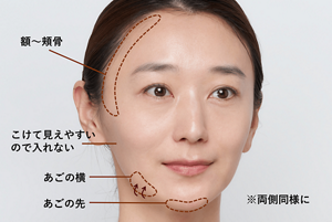 顔にファンデーションを塗ったあと、フェイスラインにだけ、暗めの色のファンデーションまたは、暗めのシェーディングパウダーを。入れる場所は、額~頬骨、あごの横、あごの先です。